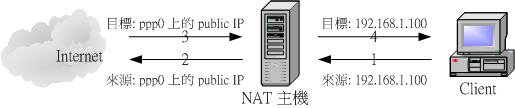 由Internet 传送回来的封包,当然由NAT 主机来接收了,这个时候, NAT 主机会去查询原本记录的路由资讯,并将目标IP 由ppp0 上面的公共IP 改回原来的192.168.1.100 ;